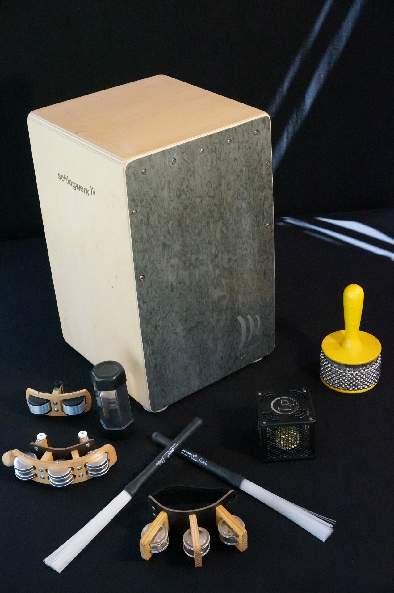 Das Cajon ist derzeit wohl eines der verblüffendsten Instrumente überhaupt und kann getrost als rhytmisches und klangliches Chameleon bezeichnet werden. Äusserlich betrachtet nur eine Holzkiste zum draufsitzen, klanglich jedoch eine Mischung aus Schlagzeugsounds und einem ganzen Universum an percussiven Klängen. Bietet das Cajon schon für sich alleine eine große Klangpalette, kann es auch noch durch andere Trommeln, Becken, HiHat, Shaker, Schellenkranz usw. zu einem kompletten Percussion Set ausgebaut werden. Der Phantasie und der Kreativität des Spielers sind hiebei keinerlei Grenzen gesetzt.